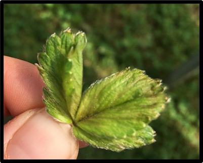 - Cyclamen mite: Mites and damage can now be found in both June-bearing and day-neutral strawberry fields. Look for damage in all fields, especially the oldest fields. Damage will look like stunted plants and crinkled, crispy, tough leaves (Below). Pinch out the youngest leaves to look for mites inside the folded leaves: