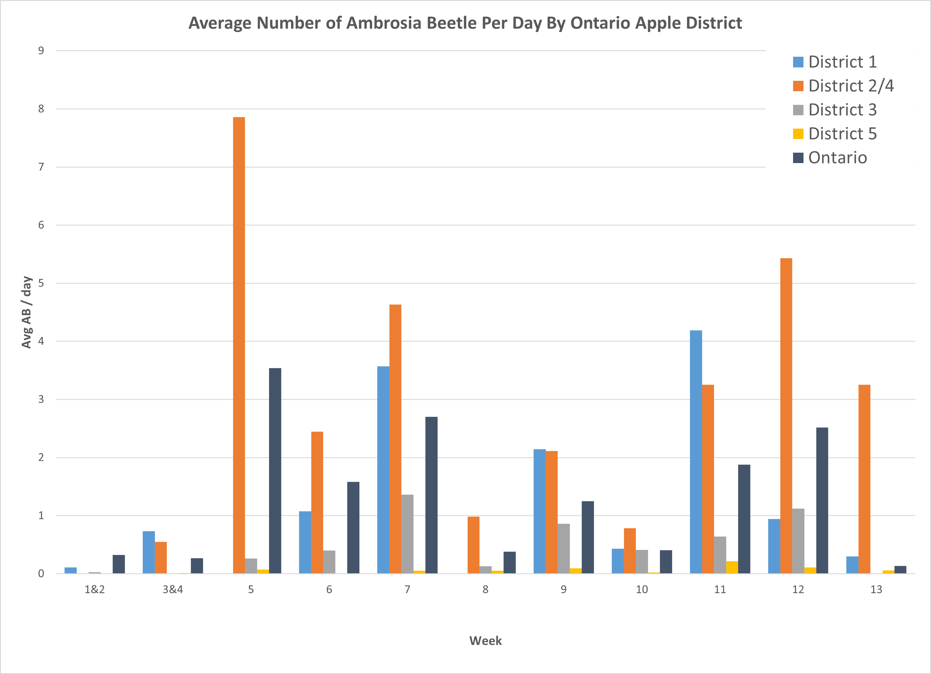 Monitoring of ambrosia beetle is on-going in orchards across the province. The following graph shows the average trap catch per week since April 1st for each district. We are currently working through identification of each species. However, based on the activity to date, it is very likely the invasive black stem borer is present in most orchards being monitored.